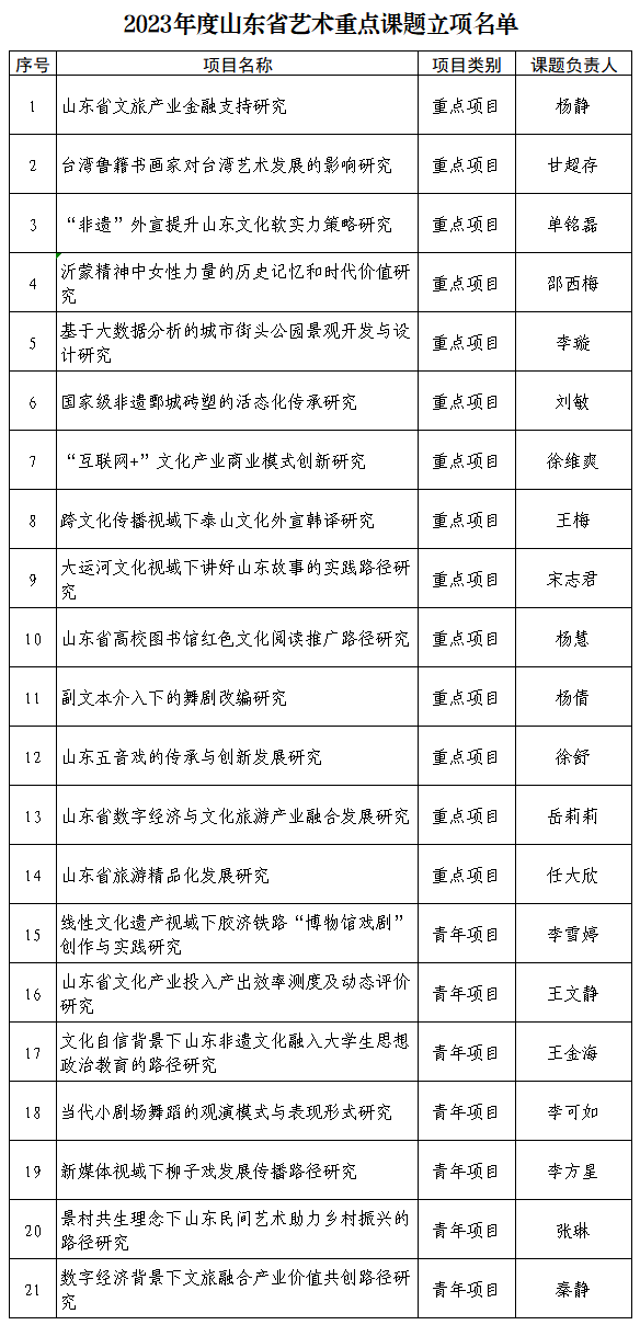 山东省文化艺术科学协会于近日公布了2023年度山东省艺术重点课题立项名单,我校21项课题获批立项,具体名单如下: