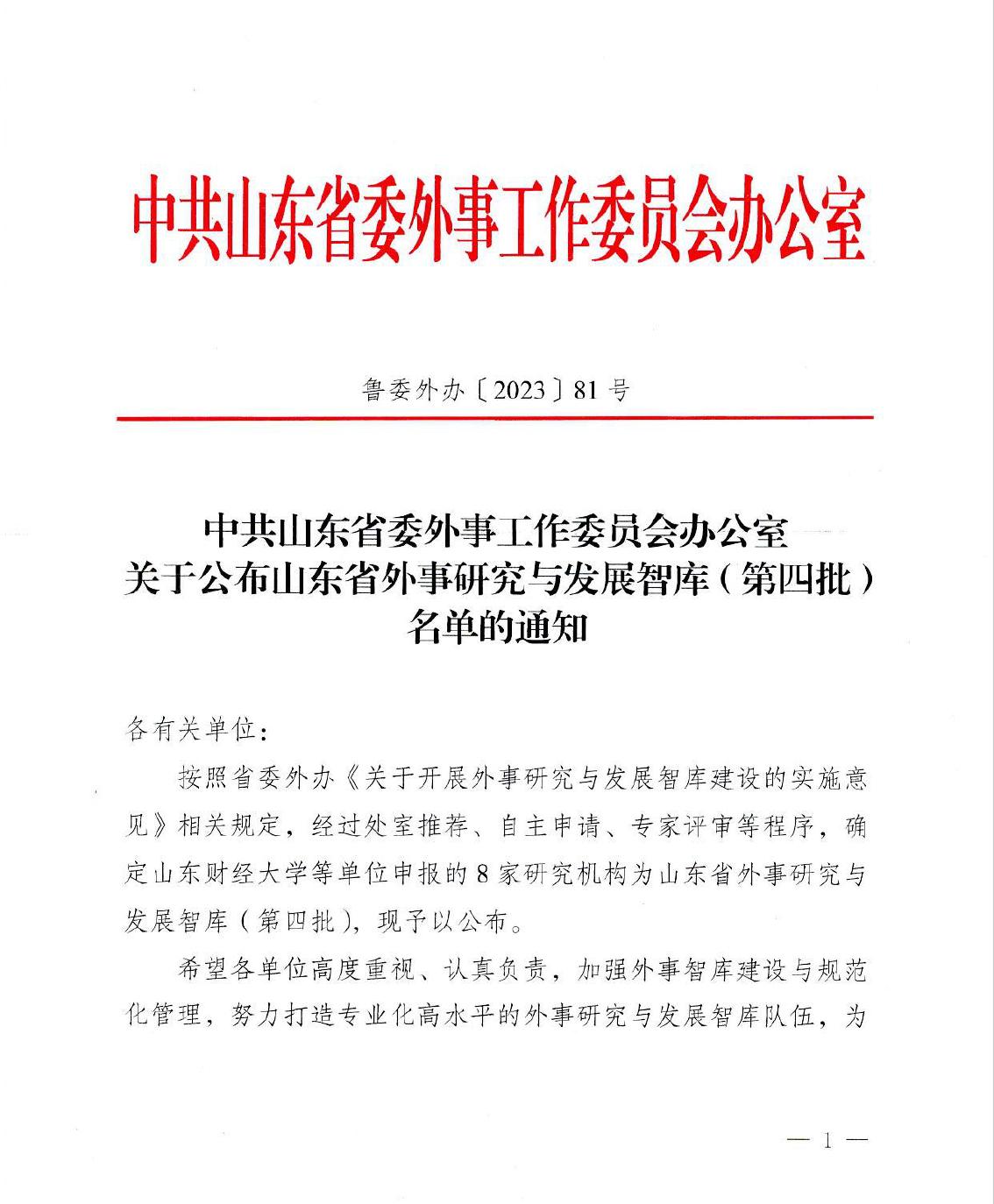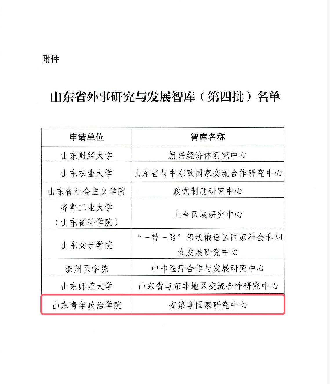 近日,中共山东省委外事工作委员会办公室印发《中共山东省委外事工作委员会办公室关于公布山东省外事研究与发展智库(第四批)名单的通知》,确定山东青年政治学院安第斯国家研究中心入选山东省外事研究与发展智库。这是我校第二个入选该智库的科研机构,也是省内唯一一所面向拉丁美洲西班牙语国家开展研究的科研机构。