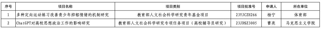 教育部社会科学司于10月19日公布了2023年度教育部人文社会科学研究项目立项名单,我校体育部杨宁的课题(交叉学科/综合研究)获青年项目立项;马克思主义学院曹亮的课题获高校辅导员研究专项立项。本年度全国高校辅导员研究专项共立项202项,此次立项实现了我校在该专项类别上的突破。