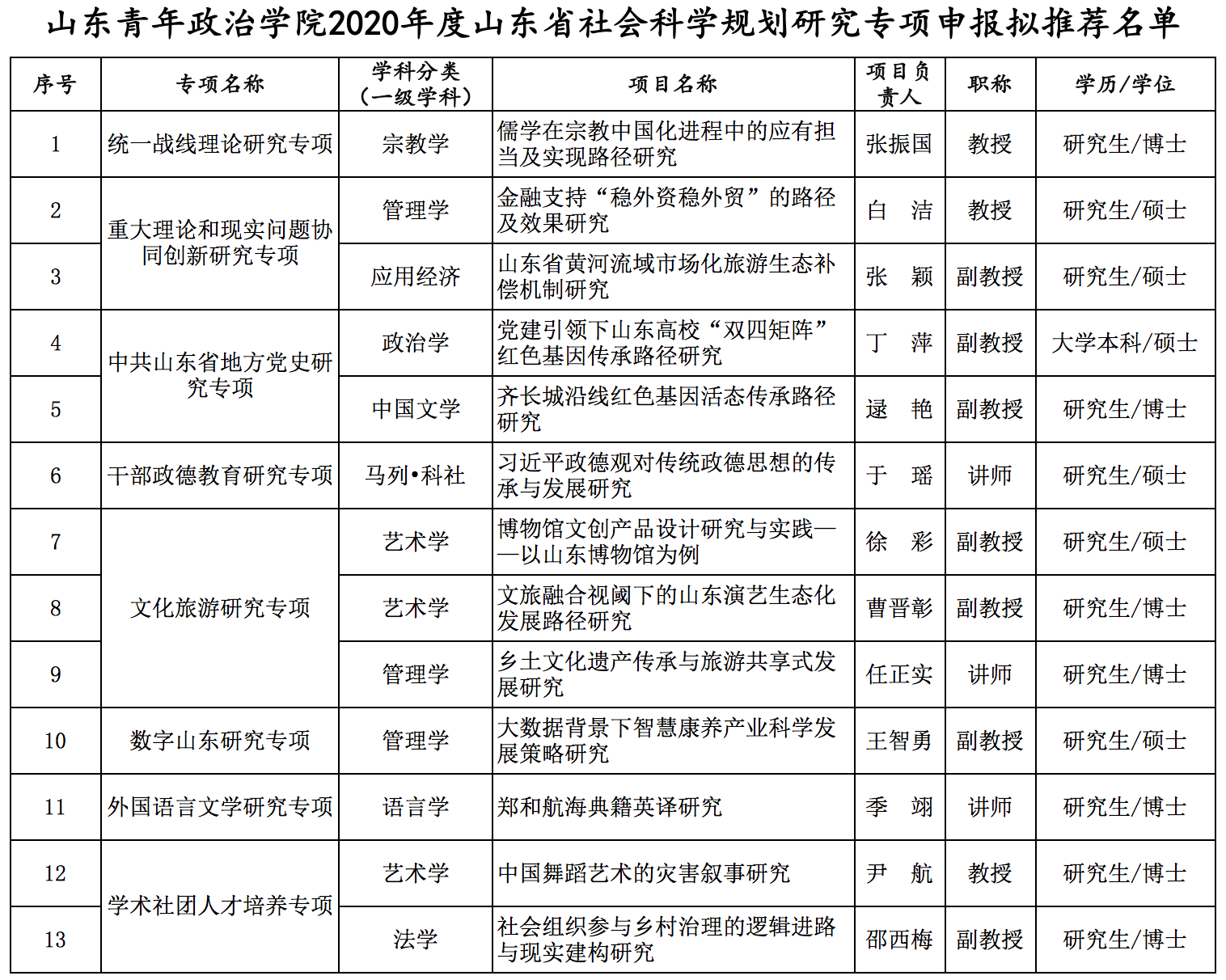 根据山东省哲学社会科学工作办公室《关于做好2020年度山东省社会科学规划研究专项申报工作的通知》要求,学校组织了山东省社会科学规划研究专项课题的申报工作。本次我校有13个推荐名额,共计10个学院的34位教师提交了申报书。经教师申报、学院初评、科研处审核、校外专家网络评审,拟推荐以下课题申报本年度山东省社会科学规划研究专项(排名不分先后),公示如下: