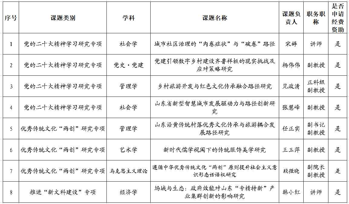 根据山东省社会科学界联合会关于申报2023年度山东省人文社会科学课题的通知要求,学校组织开展了课题的申报工作。经过教师申报、二级学院审核推荐、校外专家评审,拟确定推荐以下8项课题作为山东青年政治学院社科联推荐课题参与本年度课题的申报(排名不分先后)。现公示如下: