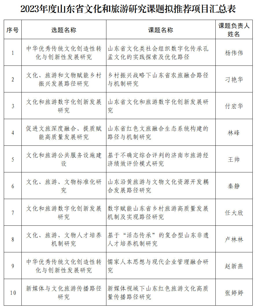 根据山东省文化和旅游厅《关于组织申报2023年度山东省文化和旅游研究课题的通知》要求,学校组织了2023年度山东省文化和旅游研究课题的申报工作。经过教师申报、学院论证修改、形式审查后,学校邀请了校外专家进行了评审,拟确定推荐以下10项课题参与本年度课题的申报(排名不分先后)。现公示如下: