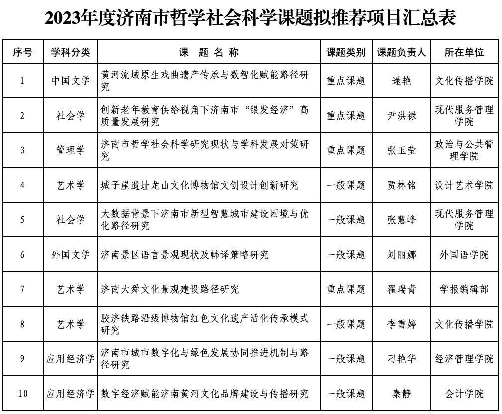 根据济南市哲学办公室有关通知要求,学校组织了开展了2023年度济南市哲学社会科学课题的申报工作。经过教师申报、学院形式审查后,学校邀请专家进行了匿名评审,拟确定推荐以下10项课题参与本年度课题的申报。现公示如下:
