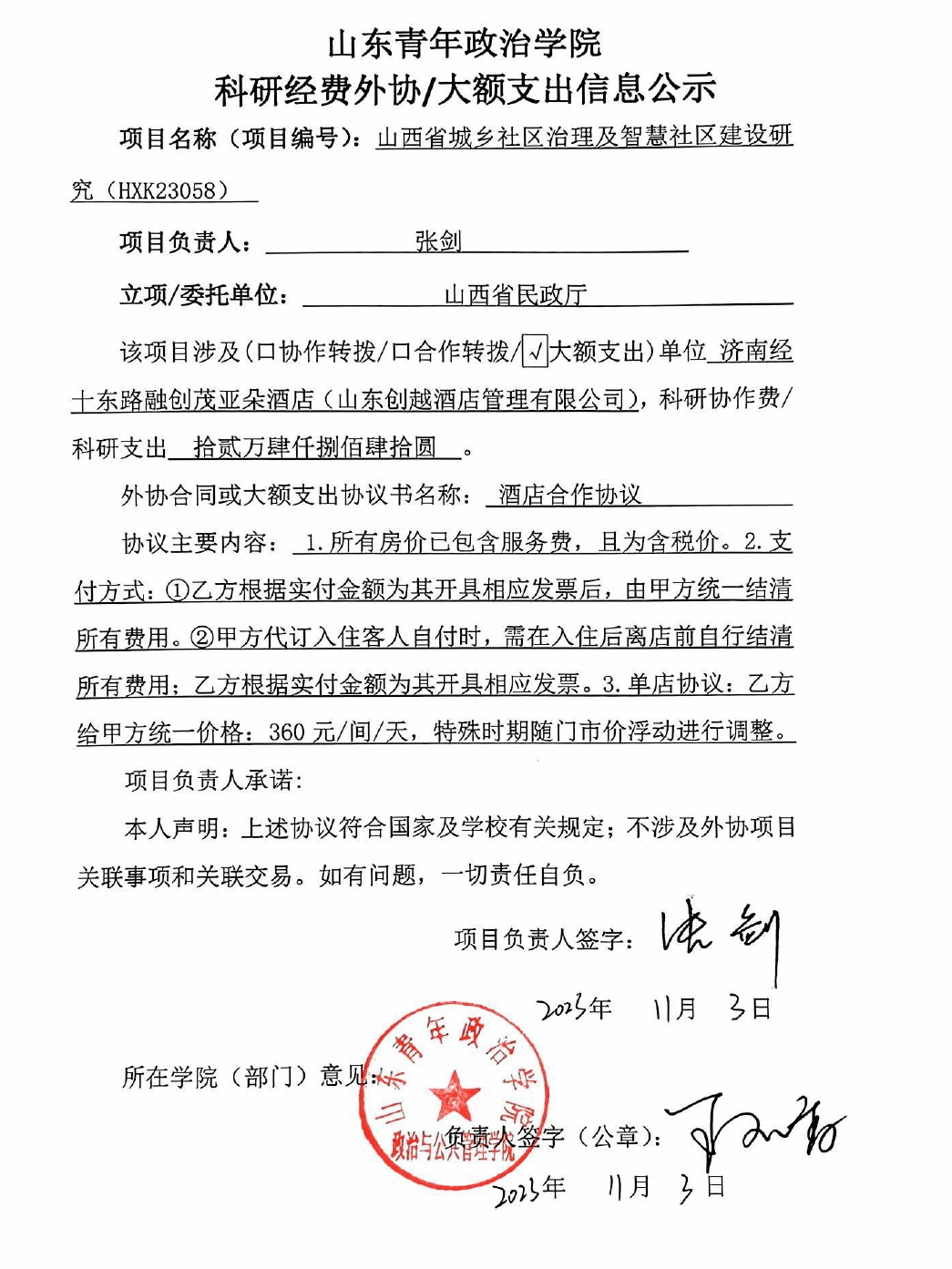 根据《山东青年政治学院横向科研项目管理办法》相关规定,现对政治与公共管理学院学院张剑主持的横向科研项目《山西省城乡社区治理及智慧社区建设研究》(项目编号:HXKT23058)大额支出情况进行公示,公示期为2023年11月6日至11月10日。公示期内,如有异议须实名书面反映到科研处。