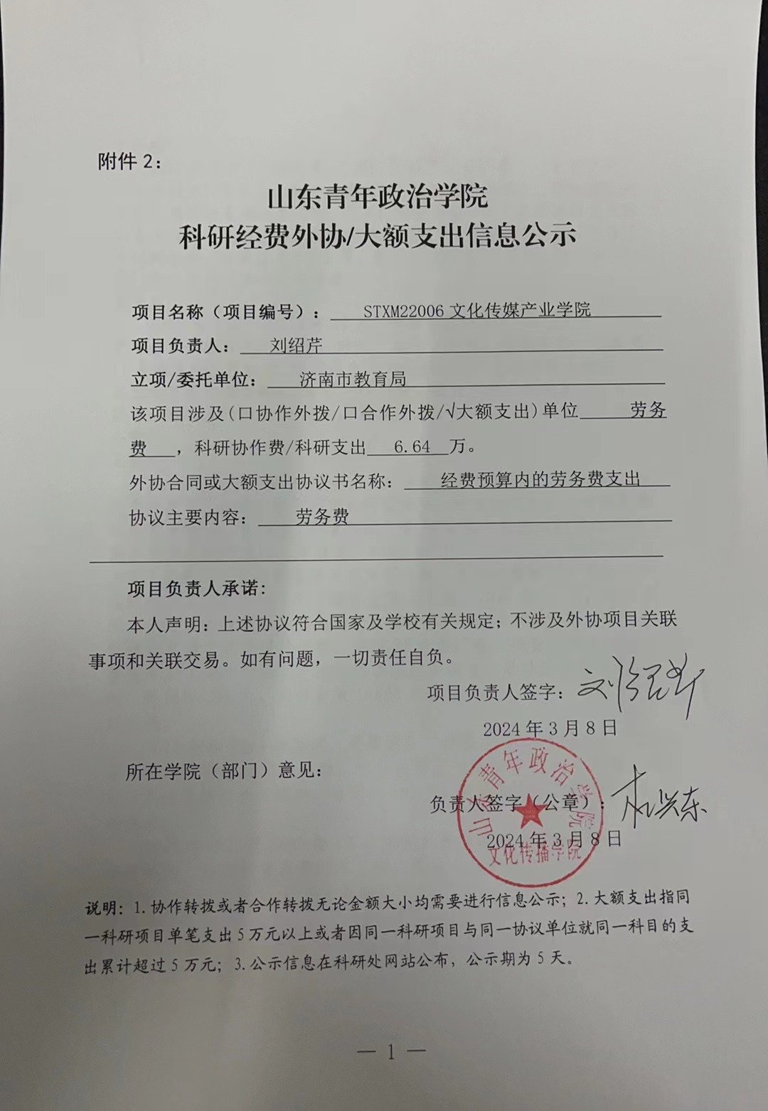 根据《山东青年政治学院纵向科研项目管理办法》相关规定,现对文化传播学院刘绍芹主持的纵向科研项目《文化传媒产业学院》(项目编号:STXM22006)大额支出情况进行公示,公示期为2024年3月8日至3月12日。公示期内,如有异议须实名书面反映到科研处。