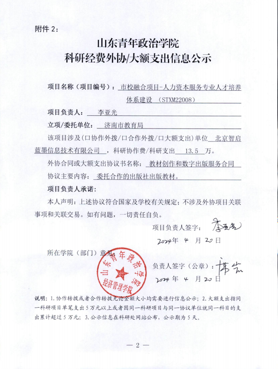 根据《山东青年政治学院纵向科研经费管理办法》相关规定,现对经济管理学院李亚光主持的纵向科研项目《人力资本服务专业人才培养体系建设》(项目编号:STXM22008)大额支出情况进行公示,公示期为2024年4月23日至4月27日。公示期内,如有异议须实名书面反映到科研处。