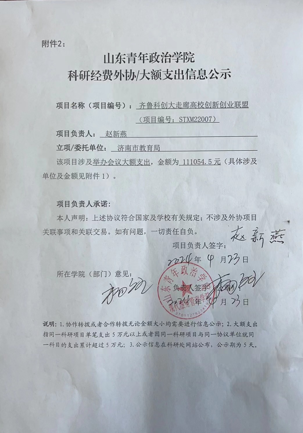 根据《山东青年政治学院纵向科研经费管理办法》相关规定,现对现代服务管理学院赵新燕主持的纵向科研项目《齐鲁科创大走廊高校创新创业联盟》(项目编号:STXM22007)大额支出情况进行公示,公示期为2024年4月24日至4月28日。公示期内,如有异议须实名书面反映到科研处。