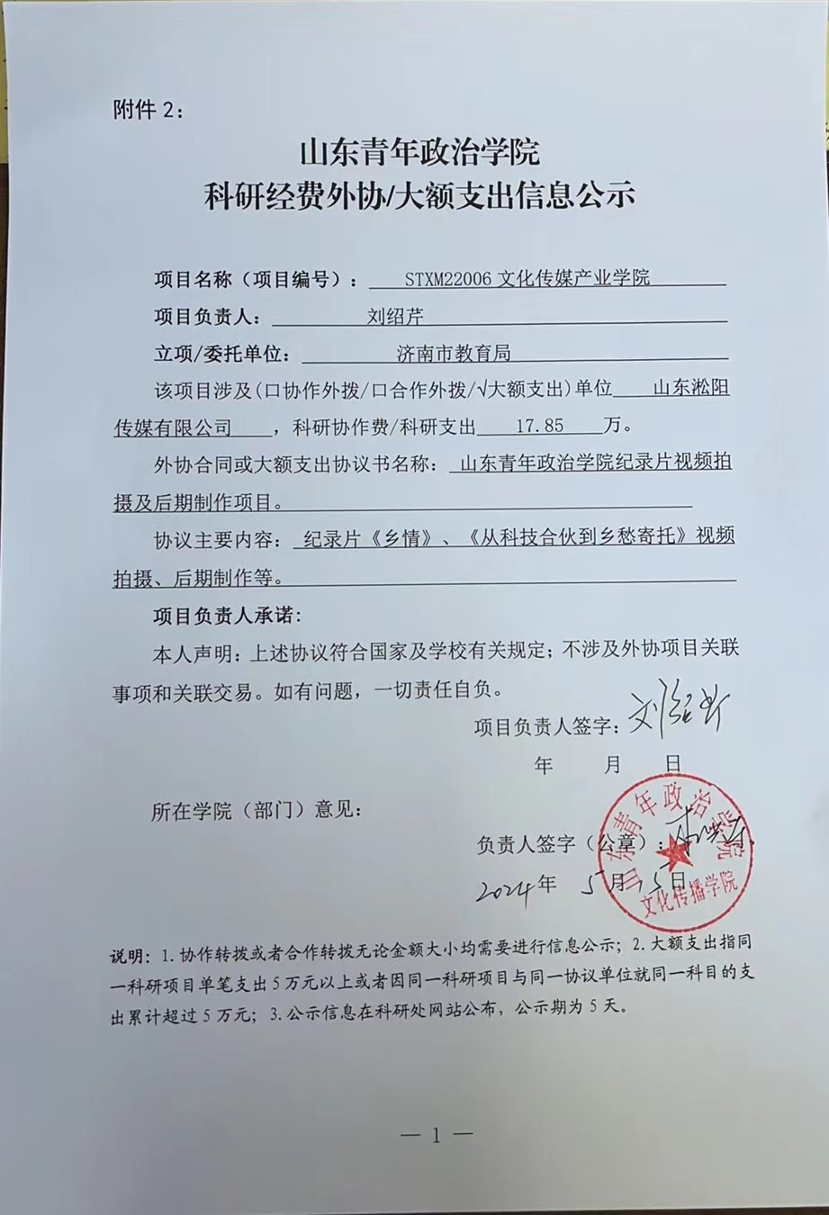 根据《山东青年政治学院纵向科研经费管理办法》相关规定,现对文化传播学院刘绍芹主持的纵向科研项目《文化传媒产业学院》(项目编号:STXM22006)大额支出情况进行公示,公示期为2024年5月15日至5月19日。公示期内,如有异议须实名书面反映到科研处。