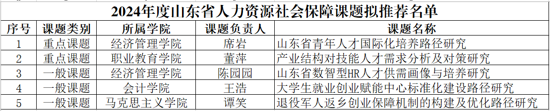 根据山东省人力资源和社会保障厅的申报通知要求,学校组织了2024年度全省人力资源社会保障课题的申报工作。经过教师申报、形式审查后,学校邀请了校外专家进校评审。学校根据专家评审意见,拟确定推荐以下5项课题参与本年度省人力资源社会保障课题的申报。现公示如下: