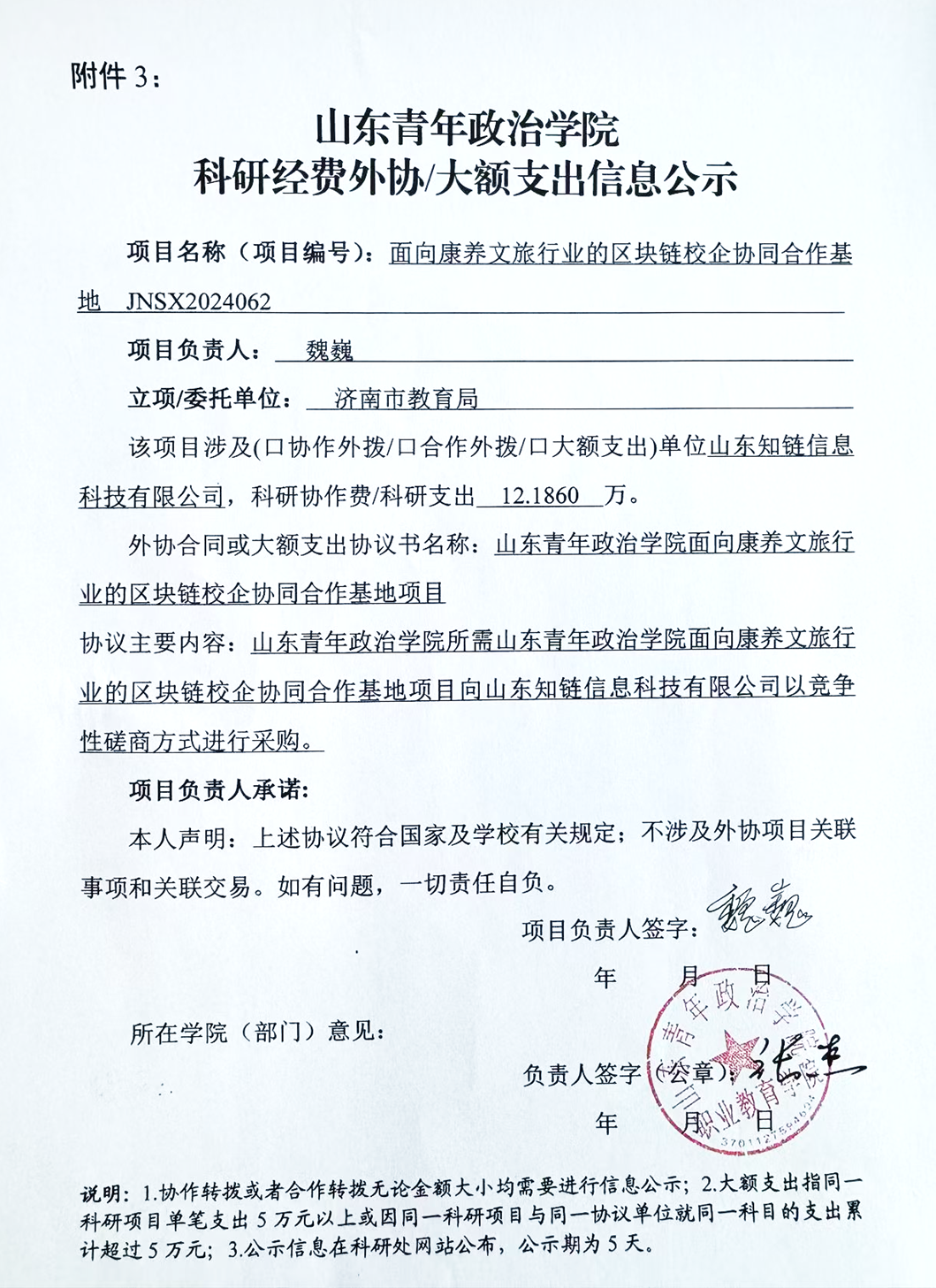 根据《山东青年政治学院纵向科研经费管理办法》相关规定,现对职业教育学院魏巍主持的科研项目《面向康养文旅行业的区块链校企协同合作基地》(项目编号:JNSX2024062)大额支出情况进行公示。公示期为2025年12月6日至12月10日。公示期内,如有异议须实名书面反映到科研处。