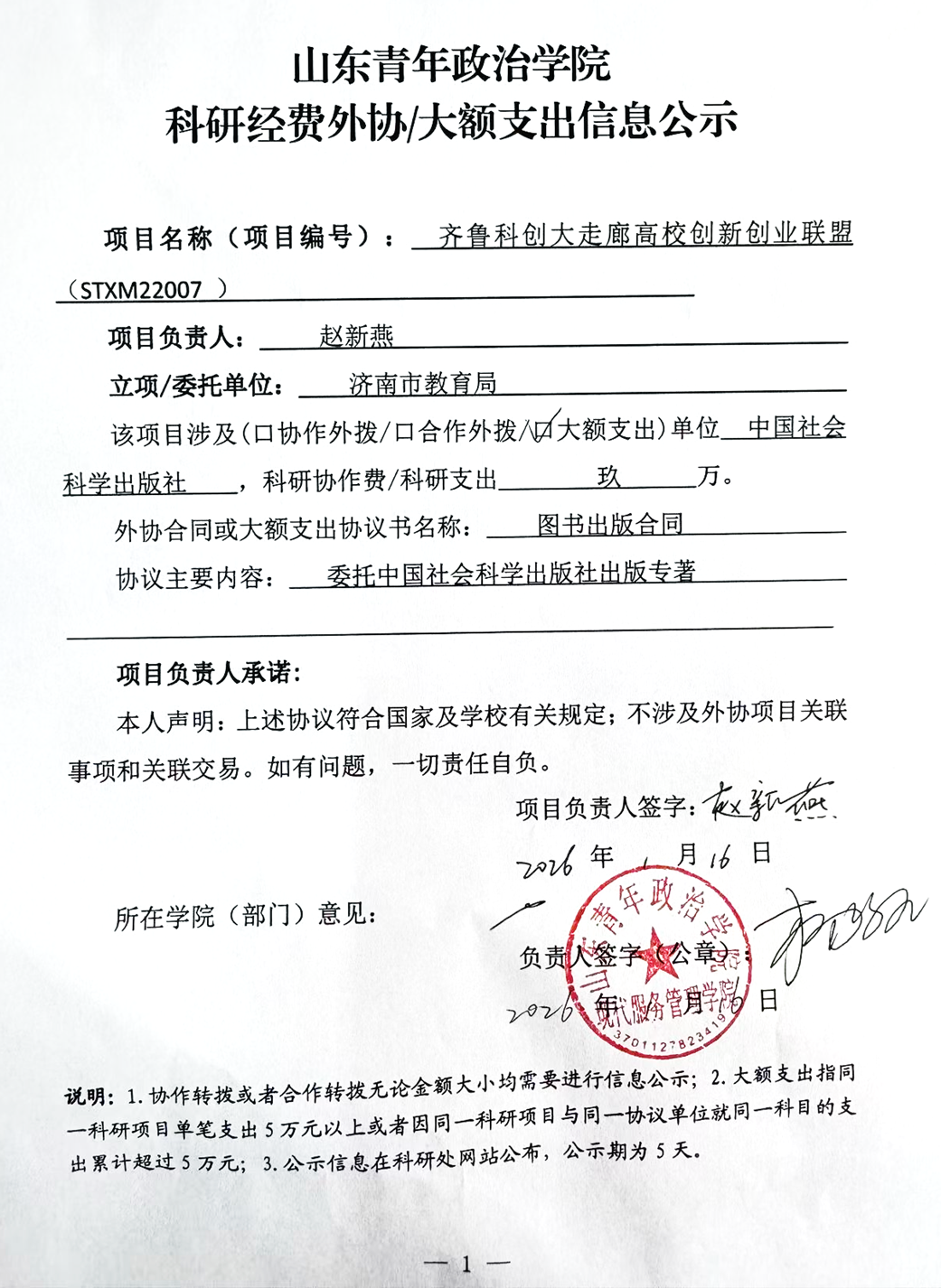 根据《山东青年政治学院纵向科研经费管理办法》相关规定,现对现代服务管理学院赵新燕主持的科研项目《齐鲁科创大走廊高校创新创业联盟》(财务编号:STXM22007)大额支出情况进行公示。公示期为2026年1月16日至1月20日。公示期内,如有异议须实名书面反映到科研处。