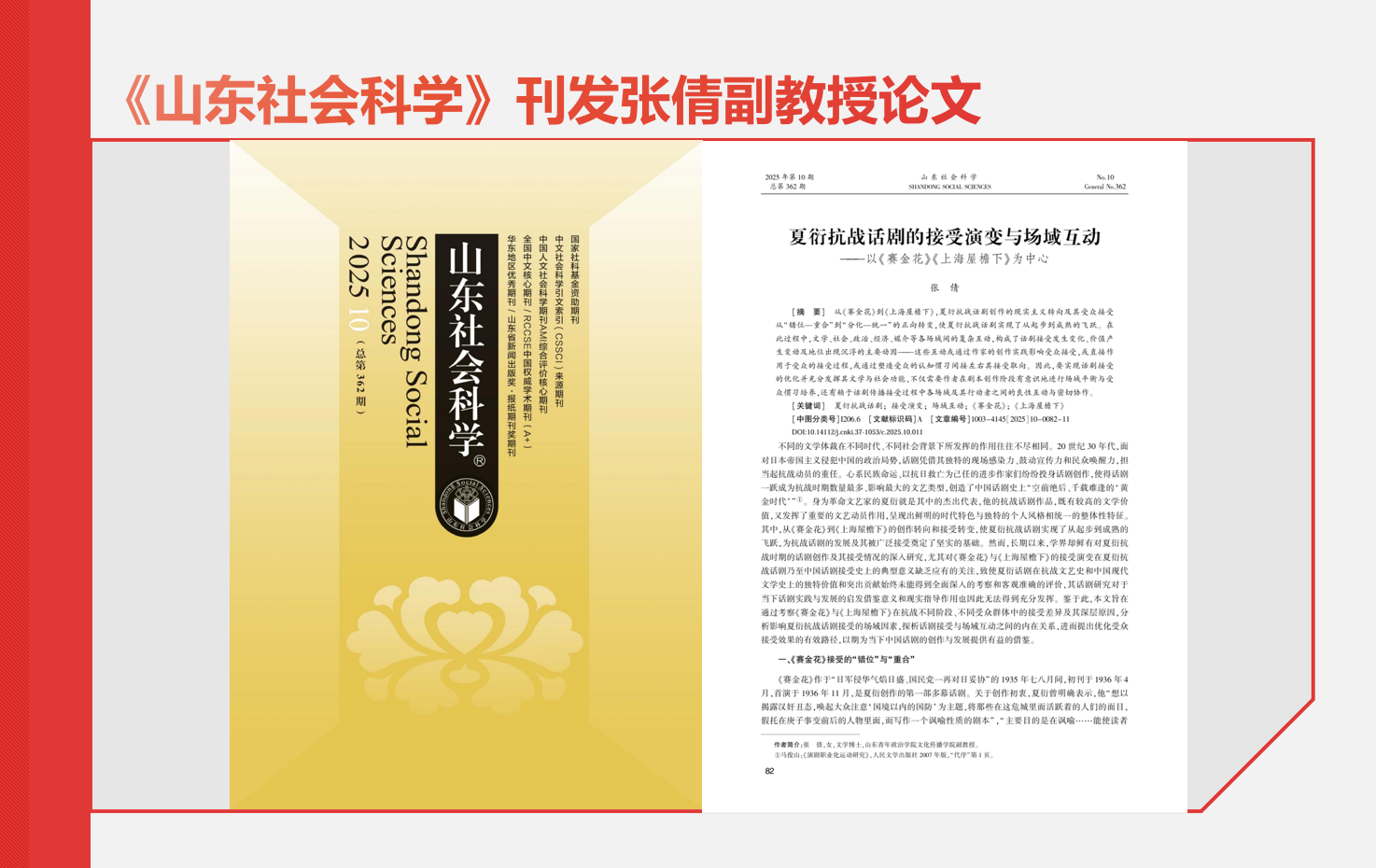 《山东社会科学》(2025年第10期)刊发我校文化传播学院张倩副教授的学术论文《夏衍抗战话剧的接受演变与场域互动———以<赛金花><上海屋檐下>为中心》。