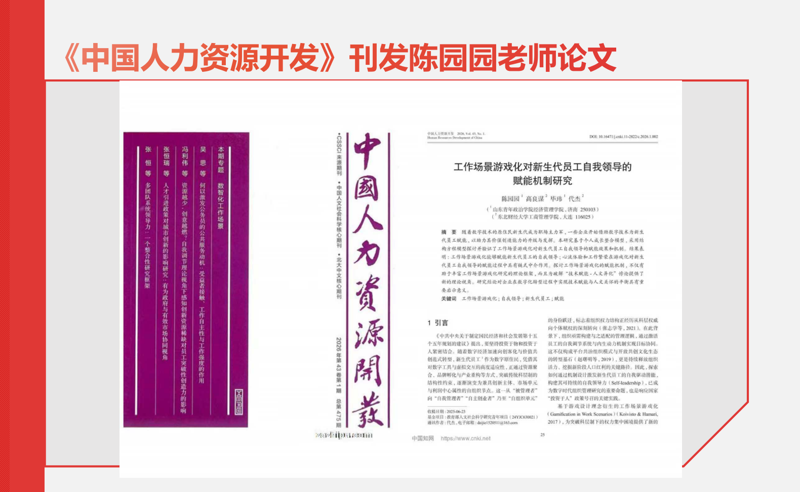 《中国人力资源开发》(2026年第1期)刊发我校经济管理学院陈园园博士学术论文《工作场景游戏化对新生代员工自我领导的赋能机制研究》。
