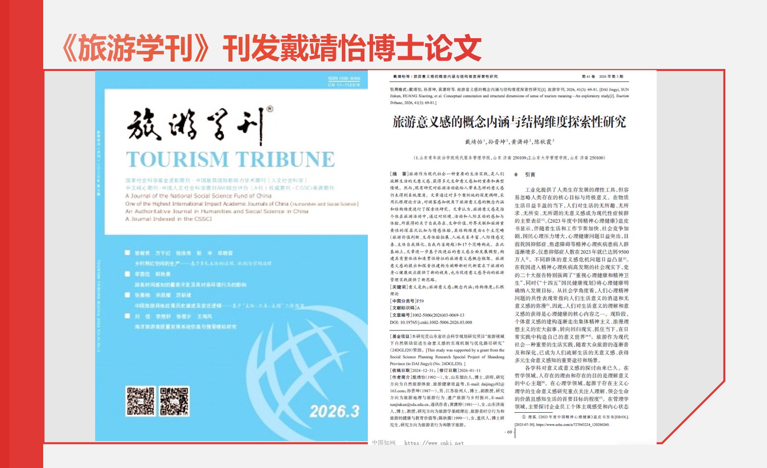 《旅游学刊》(2026年第3期)刊发我校博士戴靖怡论文《旅游意义感的概念内涵与结构维度探索性研究》。